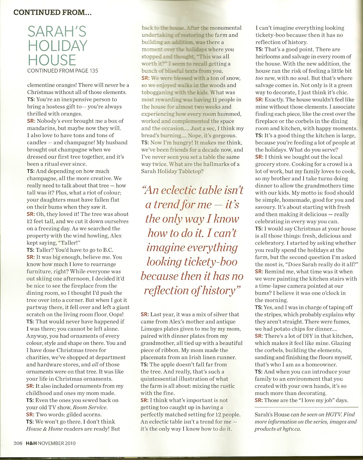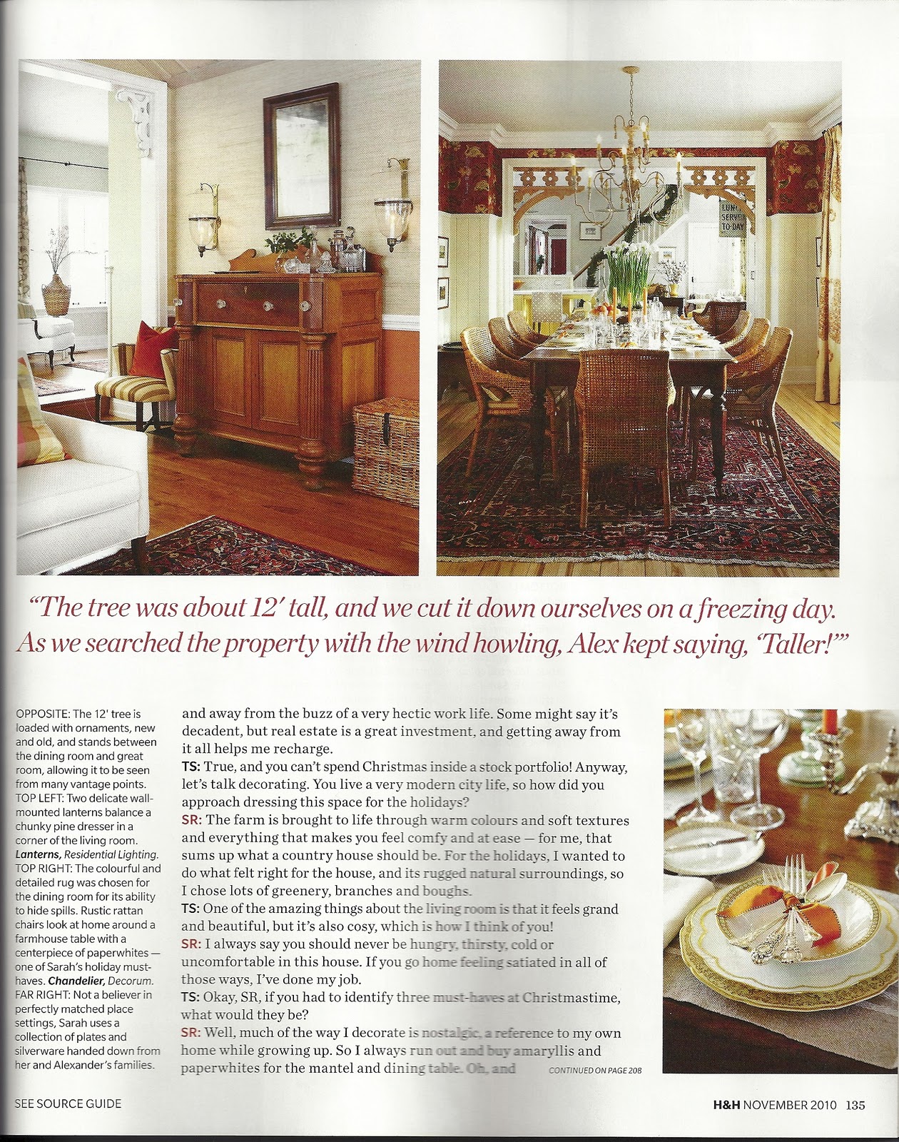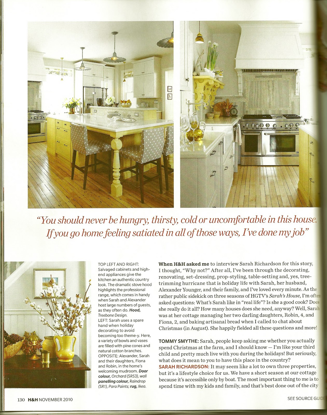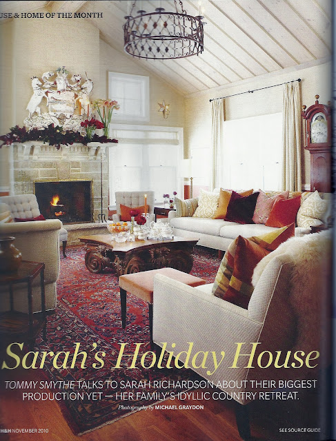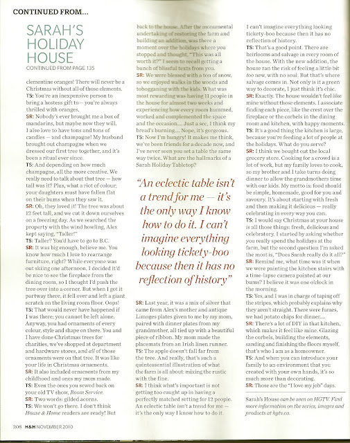 The November issue has a fantastic article about Sarah Richardson's country home that she renovated on HGTV's television show Sarah's House. Those clever Canadians talked Thomas Smythe into interviewing Sarah about the house. As you know from watching the show, Thomas, was involved in the entire reno, he is Sarah's sidekick, he is the perfect person to talk to her about he house.