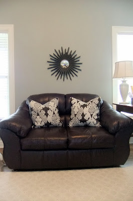 This is our home office. I think the pillows are a perfect fit for the loveseat and the wall color. Finally a bit of decor for the room.