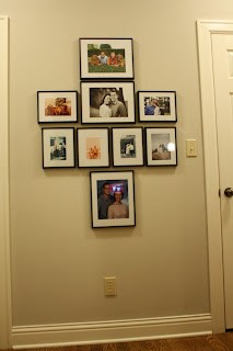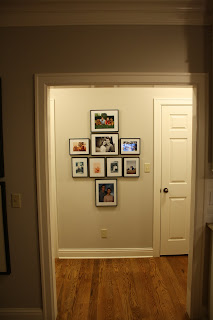 One project that I did finally complete was a photo wall in our house. I have been working on this on and off again for about three months, give or take. I just could not decide which pictures I wanted to use...procrastination....I could not decide which wall....procrastination....I could not decide what configuration I wanted the pictures to be displayed in...procrastination.