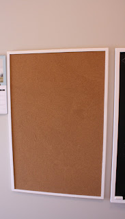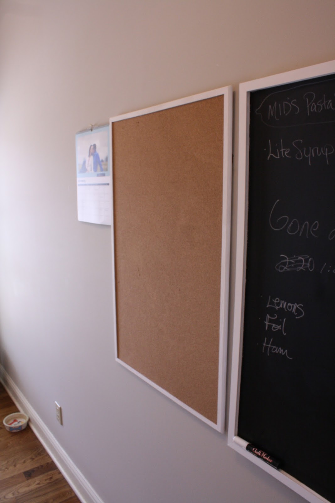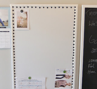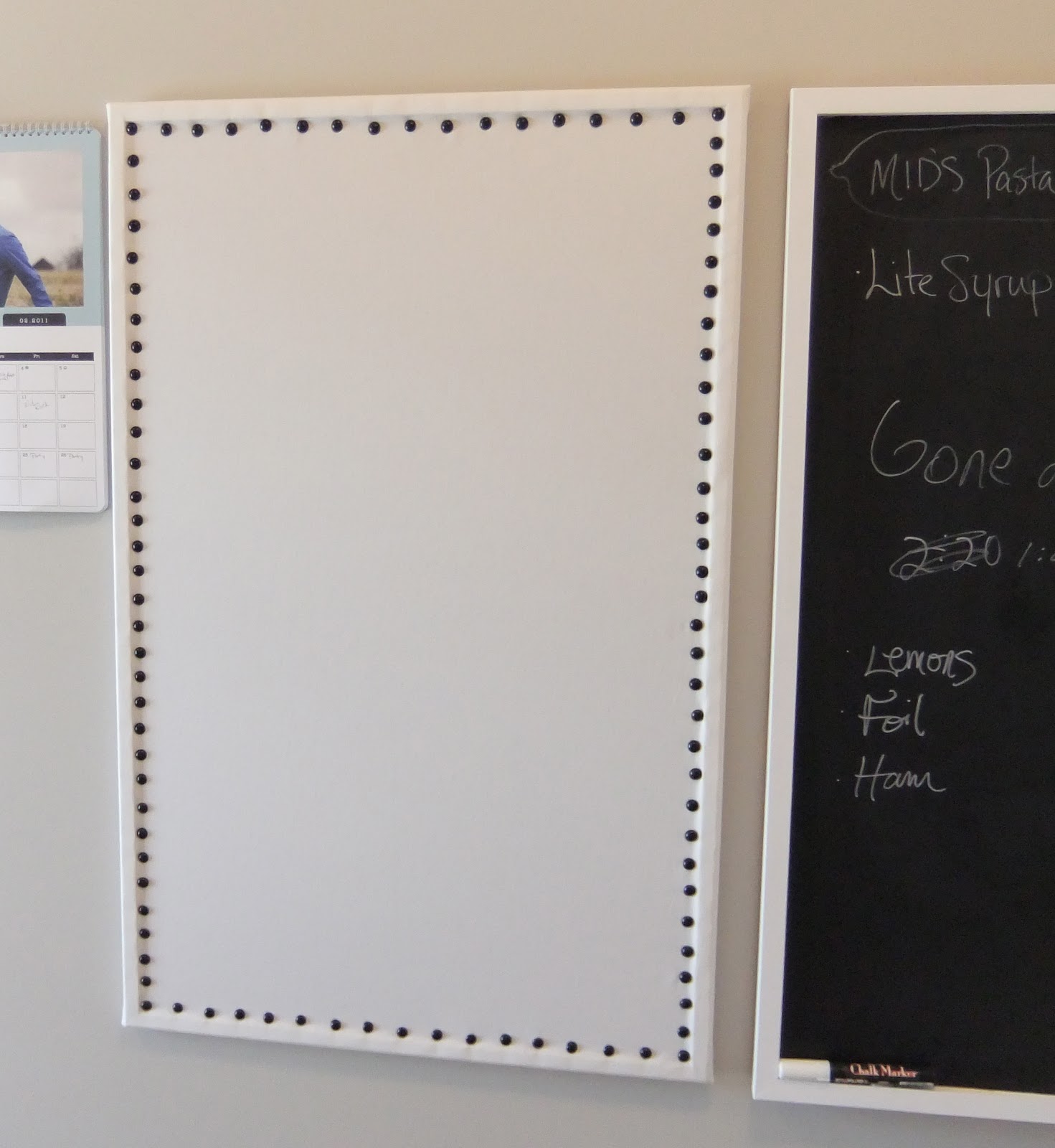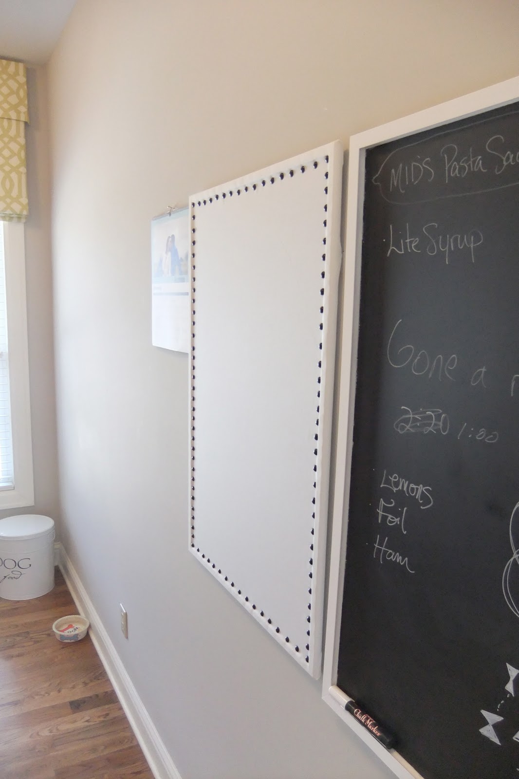 I really think this looks a ton better. Originally I wanted to use antique brass nails, but Lowe's did not have what I wanted. I went with the black to match the chalkboard. I am glad I did, I really like the black and white combination. It makes both boards look cohesive next to each other.