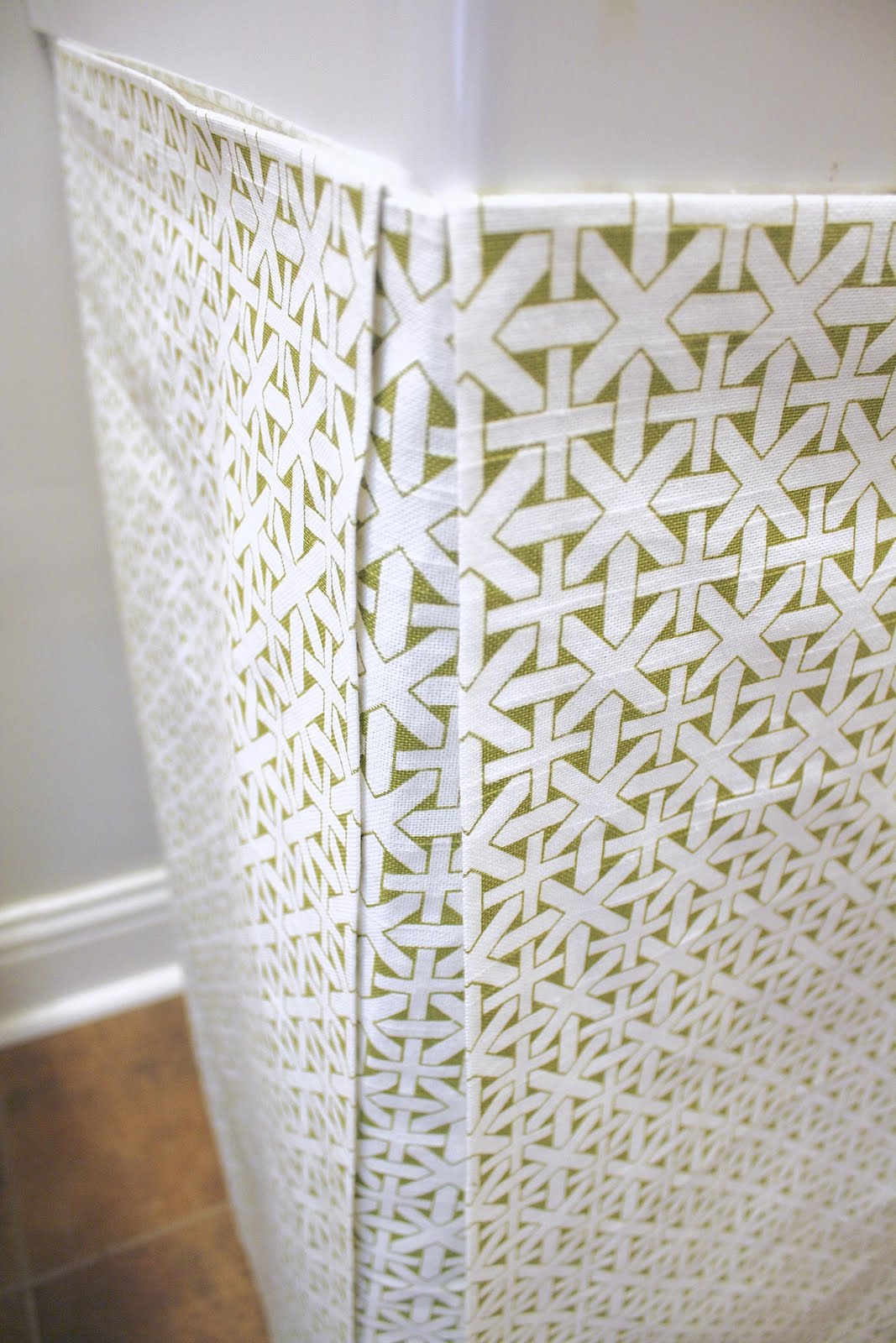 I decided to make a “no sew” skirt to hide the bottom half of the sink. I paid $8.48 for 3/4 yard of fabric in a geometric print. First, I measured the sink and to see how much fabric I needed for the front, side and corner panel. I wanted the skirt to look custom and have easy access to the cleaning bucket underneath.