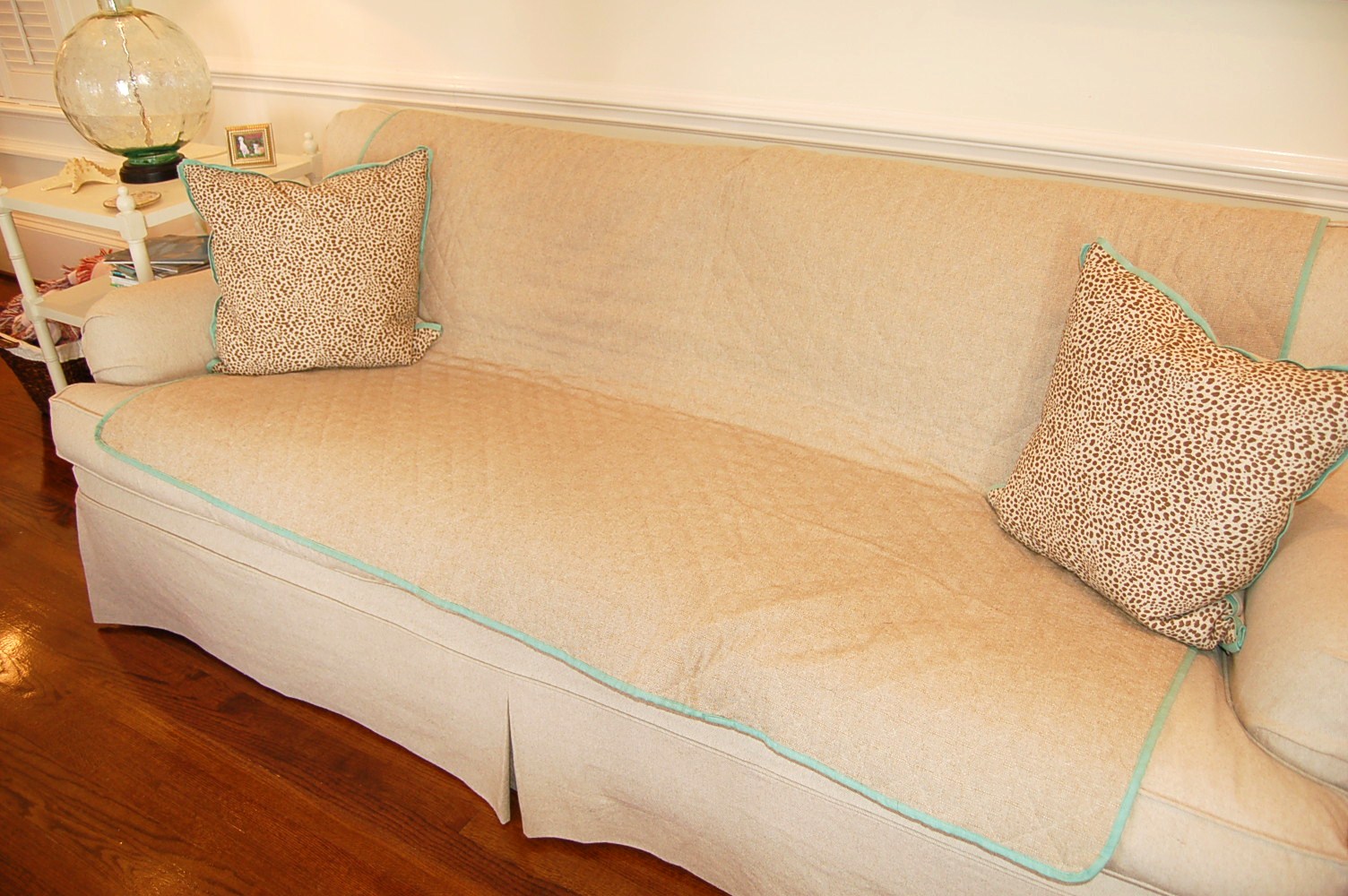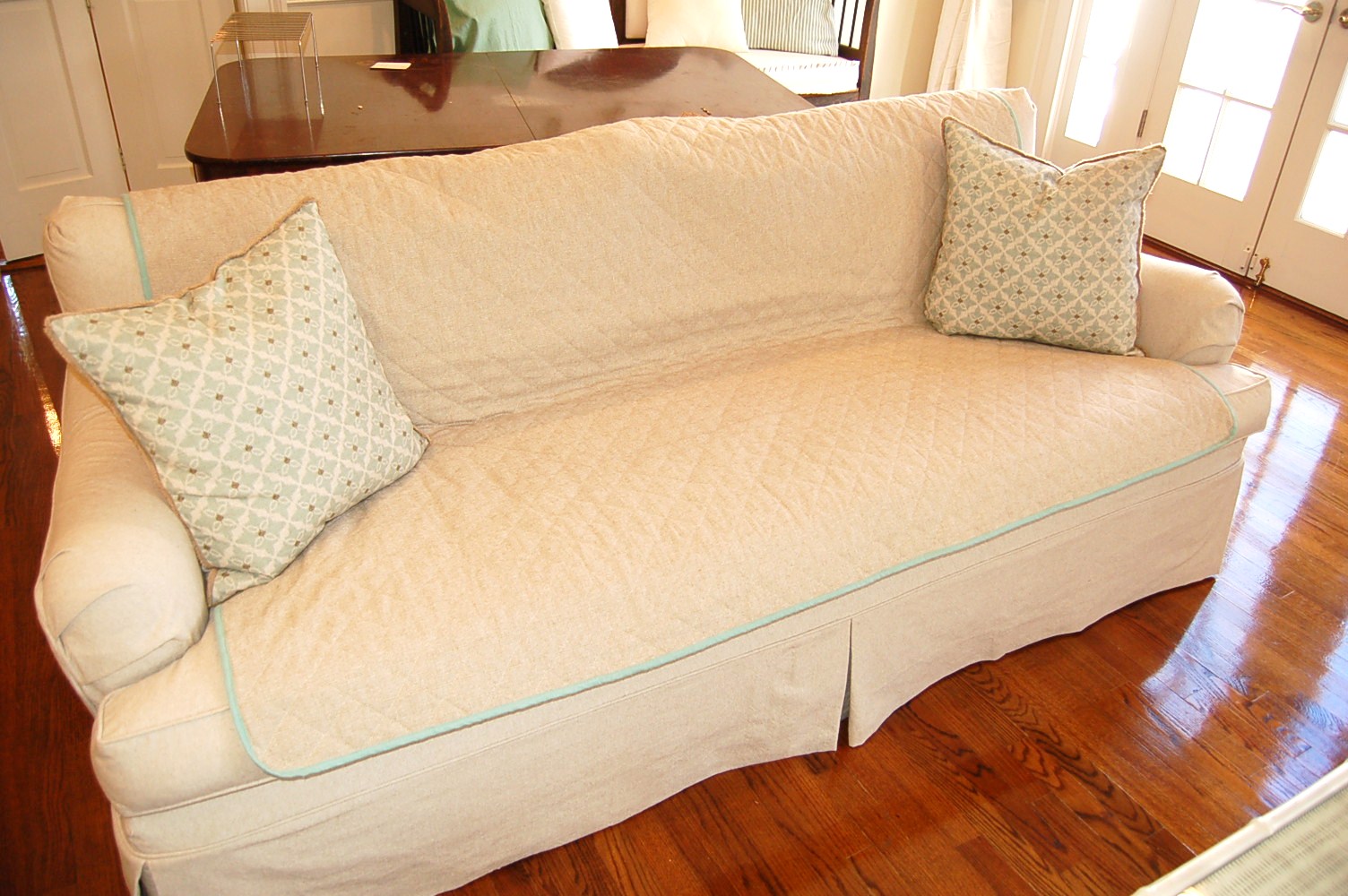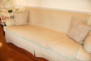 I mentioned in a recent post that I am ordering slipcovers for the Rachel Sofa and Chair that we have and Sarah of Chestnut Lane Home commented to let me know that she carries a really great quilt in an oatmeal color that fits perfectly on the "Rachel". She sent me some great pictures of the quilt. Honestly, it just blends right with the sofa, so it offers great protection against spills and pets.