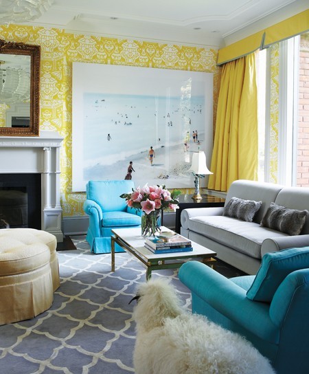 I love the beach photo that is enlarged to cover the entire wall. Something about this image just pulls me in. I like the pops of color with the sunny yellow and turqoise chairs. The fluffy sheep ottoman adds unexpected whimsy and texture to the space. I am sure you have seen lots of sheep at the beach. Right? Even though it is a little crazy, it works.