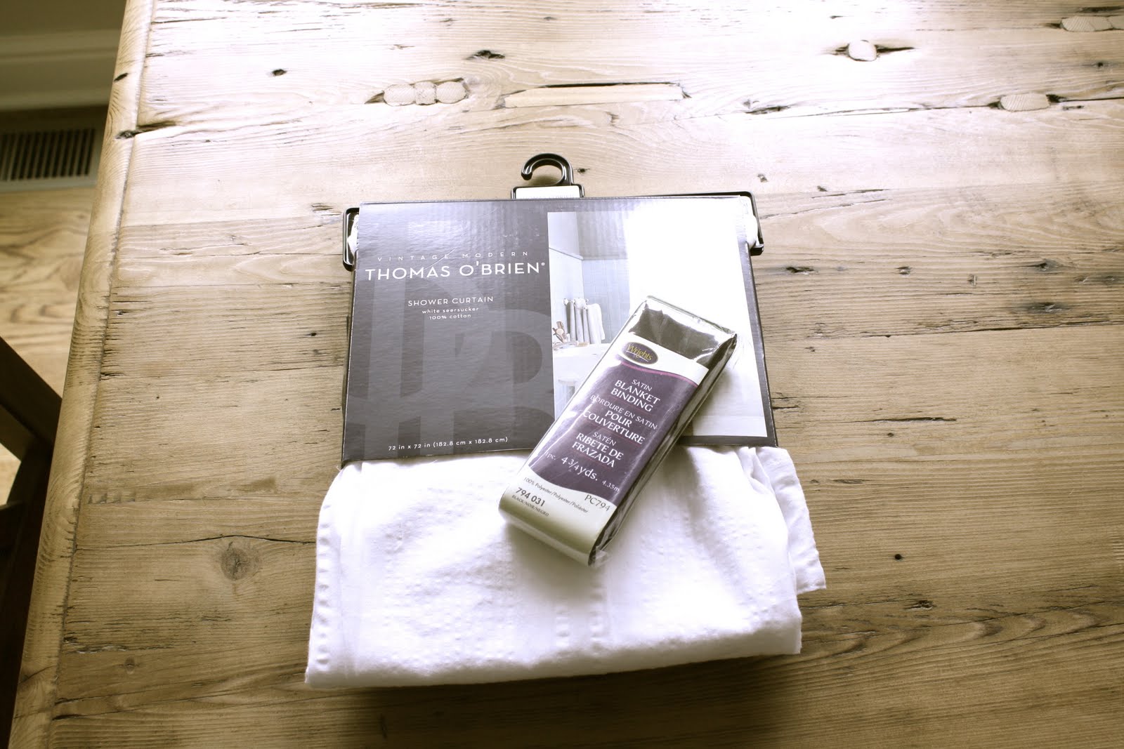 I bought another curtain to match the existing one from Target and some quilt binding (another crappy photo). I just ironed this trim onto each curtain.