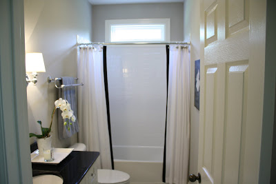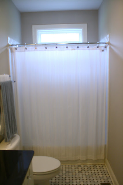 The bathroom is blah. Nothing really going on in here as far as style goes. I have a plain, white shower curtain and that is about all.